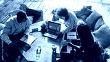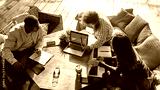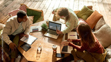 Cheerful young multiracial colleagues discussing project