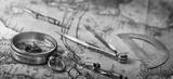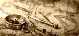 An old geographic map with navigational tools: compass, divider, ruler, protractor. View of the workplace of ship's captain. Travel, geography, navigation, tourism and exploration concept background.