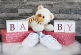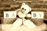 Buchstabenwürfel Baby mit babyschuhen und Geschenken.