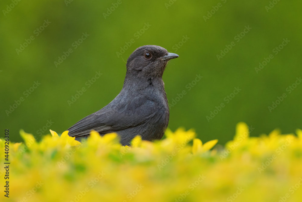 Northern Black-flycatcher - Melaenornis edolioides, beautiful all black passerine bird from African woodlands and forests, Awassa, Ethiopia.