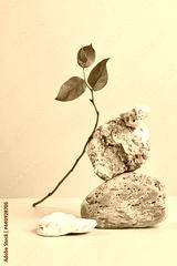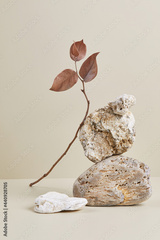 Abstract nature scene with composition of stones and dry branch. Neutral beige background for cosmetic, beauty product branding, identity and packaging. Natural pastel colors. Copy space, front view.