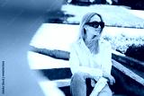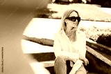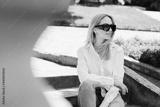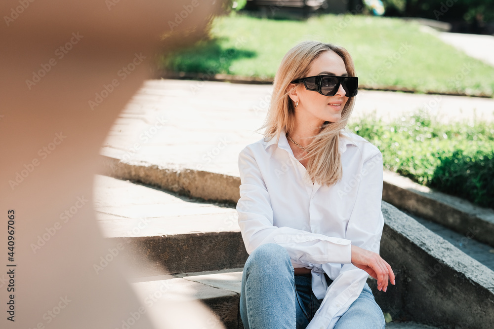 Elegant Cheerful Woman Sitting on the Stairs in the Public Park, Female Entrepreneur Wearing Sunglasses and Looking Away with Smile While Waiting for Meeting