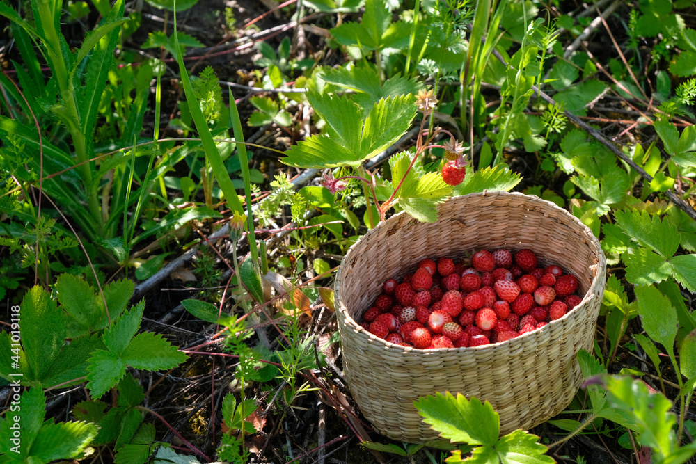 Wicker basket with wild strawberries on a forest glade on a sunny morning in Ukraine.