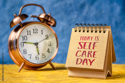 today is self care day reminder - handwriting in a desktop calendar with alarm clock, mental, emotional, and physical health concept