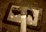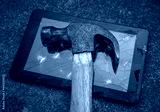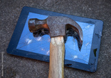 A metal hammer with a wooden handle lies on the broken display of a tablet computer