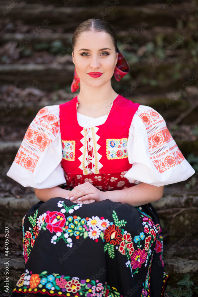 Belle jeune femme slovaque en costume traditionnel. folklore slovaque