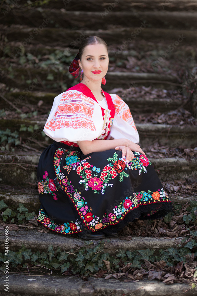 Belle jeune femme slovaque en costume traditionnel. folklore slovaque