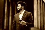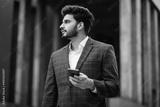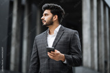 Successful arabian businessman standing on city street, holding modern cell phone and looking aside. Handsome man with beard wearing stylish formal clothes.
