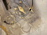 Abstract vanilla background with gold and grey — beautiful brush strokes, smears and gold spots. Fragment of modern painting with beige and grey texture resembles watercolor or aquarelle painting.