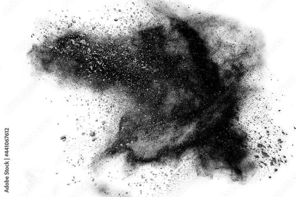 particles of charcoal on white background,abstract powder splatted on white background,Freeze motion of black powder exploding or throwing black powder.