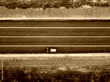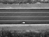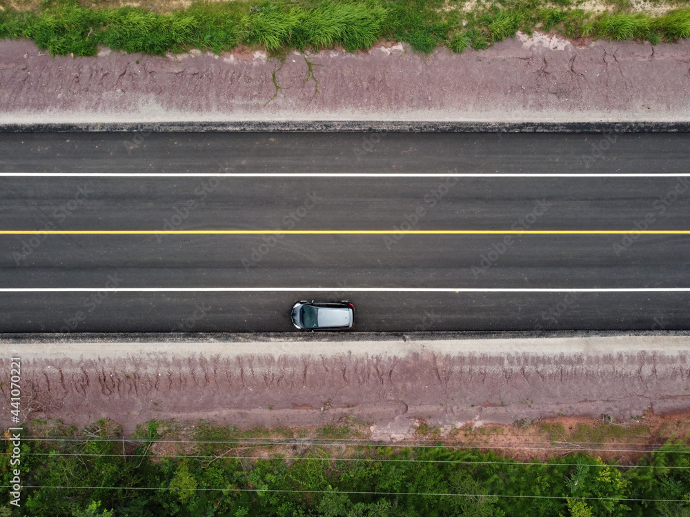 Top view of a country road with cars parked on the side of the road, drone aerial shot