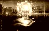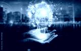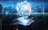 Man hand using digital artificial intelligence holographic projection 3D rendering