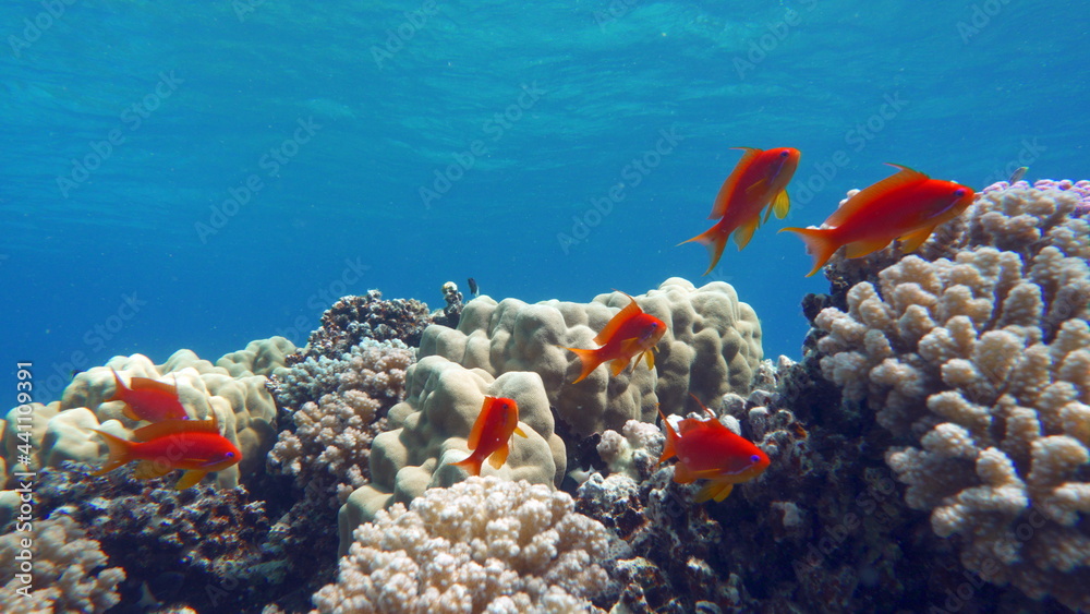 Sea Goldie. The most common antias in the Red Sea. Divers see him in huge flocks on the slopes of coral reefs.