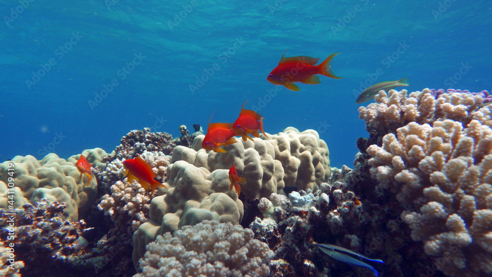 Sea Goldie. The most common antias in the Red Sea. Divers see him in huge flocks on the slopes of coral reefs.