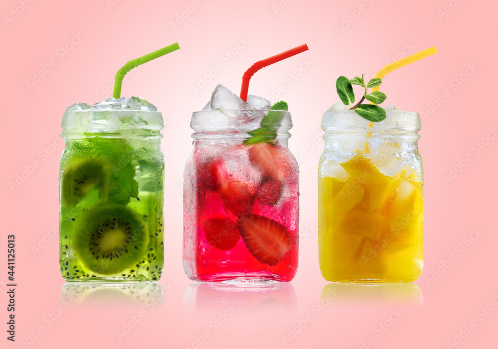 Bright Colorful refreshing summer drinks in glass jars and straws on a pink background