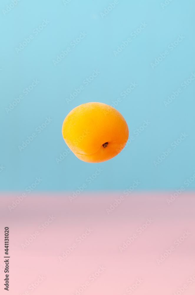 Fresh organic flying apricot on pastel blue and pink background. Fresh summer fruits creative layout, levitation. Vegan raw food entertainment concept. Trending wallpaper website blogs design pop art.