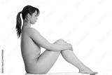 Nude overwieght woman is sitting with hands on knee.