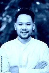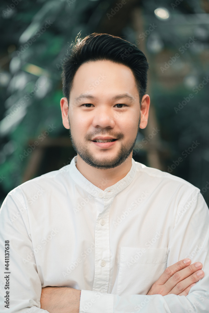 Portrait of a casually dressed handsome young Asian man smiling while standing alone outside on garden.