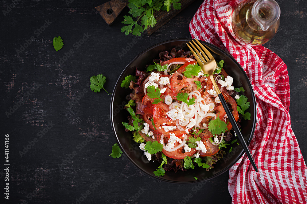 Vegetable salad with tomato, fresh lettuce, soft cheese and onion. Healthy diet food. Top view, above