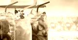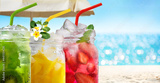 Summer refreshing exotic drinks cocktails in glass jars with straws on seascape with bokeh sun light background.