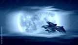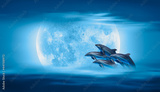 Silhoutte of dolphins jumping up from the sea at sunset with full moon "Elements of this image furnished by NASA "