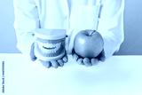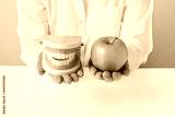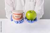Dentist holding jaw teeth model and green apple. Healthy eating and teeth health concept.