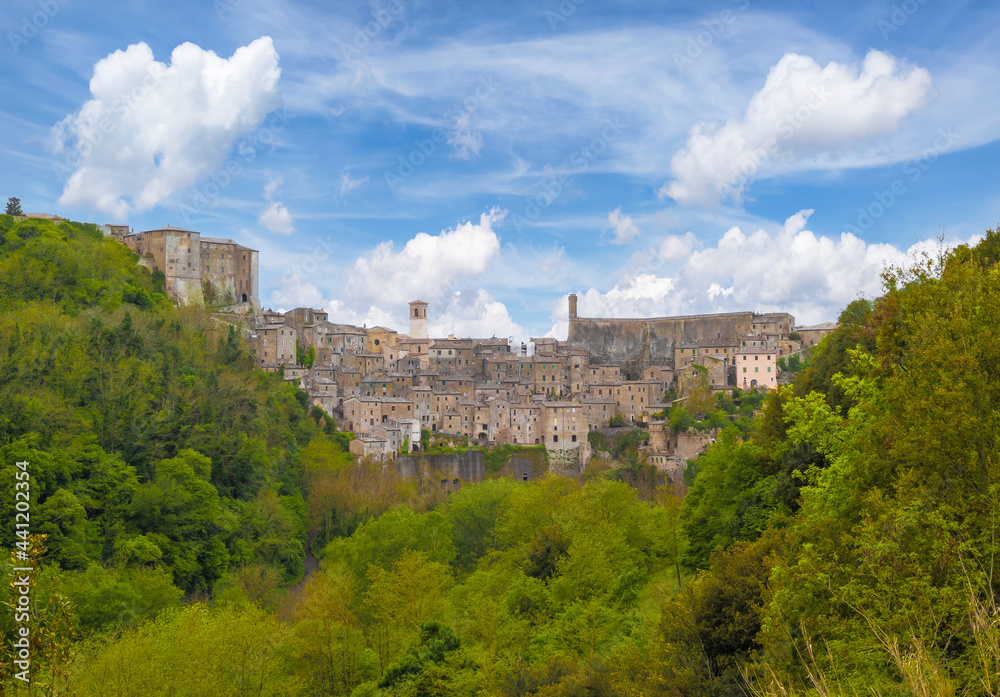 Sorano (Italy) - An ancient medieval hill town hanging from a tuff stone in province of Grosseto, Tuscany region, know as the Little Matera.