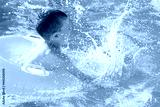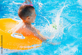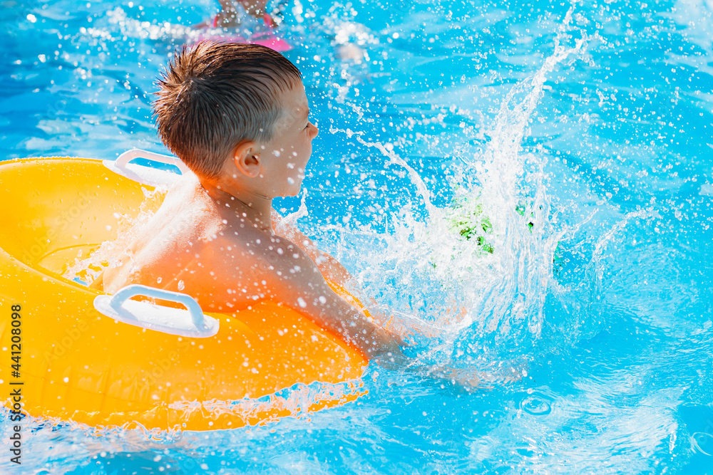 Kid boy playing outdoor pool of resort. in an inflatable yellow circle with a ball. Children frolic with water toys.