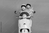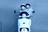 Photo of grey haired married couple ride bike happy hold map vacation trip isolated on pastel blue color background
