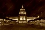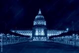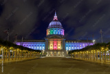 Summer blue foggy skies over San Francisco City Hall lit up in rainbow colors for the 2021 Pride