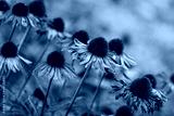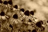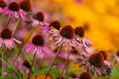 Gorgeous pink Echinacea flowers in a garden against a yellow backdrop of other flowers, photographed in fall