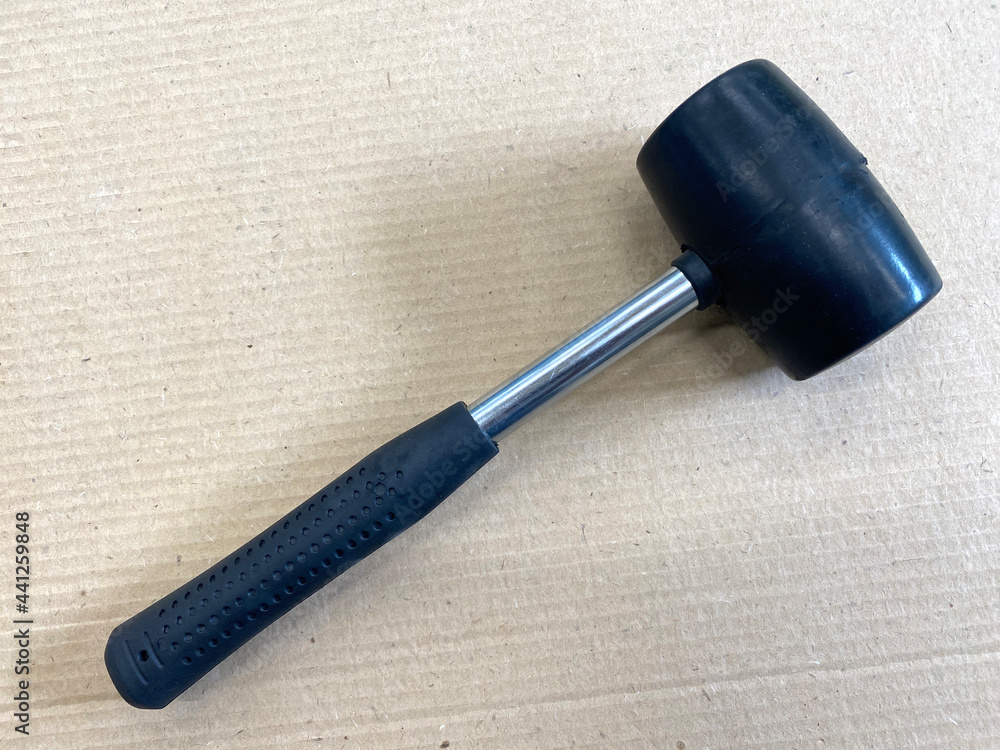 Black rubber hammer Mallet for nailing on a cardboard backing