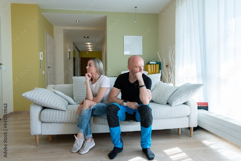 Sad depressed man and sad woman on the couch. Quarrel between a man and a woman.