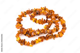 Baltic necklace made of Natural polished transparent honey luxury amber beads with inclusions on white. close up selective soft focus. Space for text