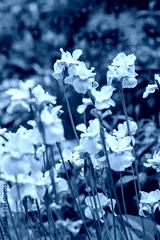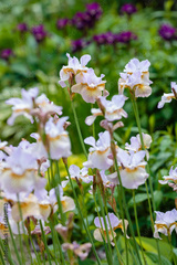 Group of blooming Siberian irises (iris sibirica) in the garden.