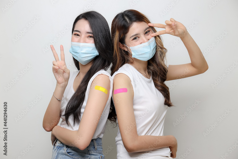 Smiling Of Asian Women Show Bandage On Arm. Happy Women Feel Good After Received Covid-19 Vaccine.