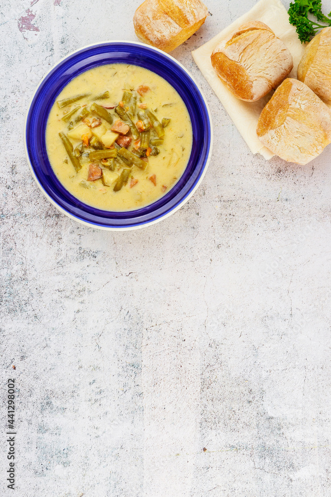 Homemade vegetable soup with bread in blue plate.
