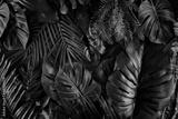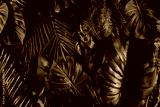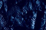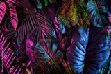 Tropical dark trend jungle in neon illuminated lighting. Exotic palms and plants in retro style.