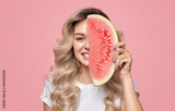 Cheerful woman with slice of watermelon