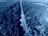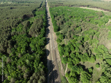 Aerial view of railroad in sunny summer day in forest. Top view of Logistics, trade, shipping ways.