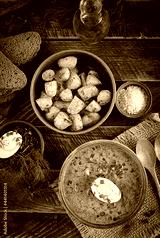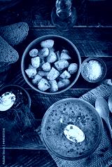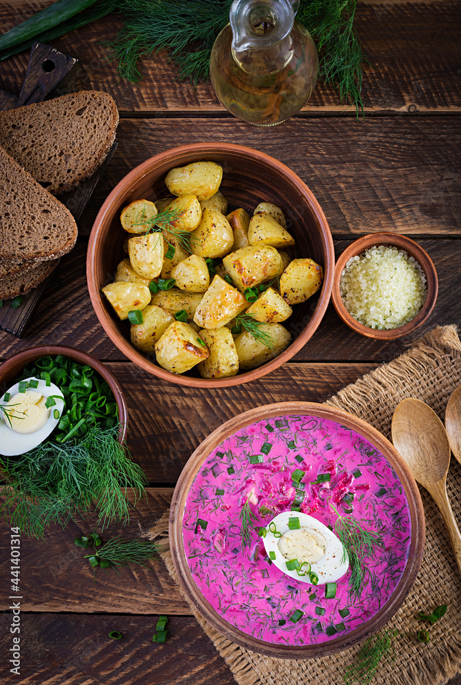 Cold borscht, summer beet soup with fresh cucumber, boiled egg and baked potatoes on wooden table. Traditional European food, delicious lunch. Top view, overhead