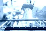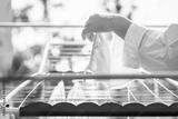 Woman hands hanging her laundry on balcony on the drying rack opposite palm trees view at sunset sunshine. Closeup. Cropped