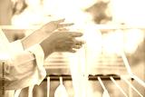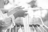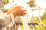 Woman hands hanging her laundry on balcony on the drying rack opposite palm trees view at sunset sunshine. Closeup. Cropped