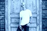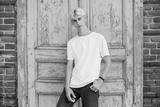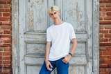 A young blond man in a white t-shirt stands against the background of an old wooden door.