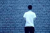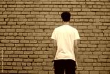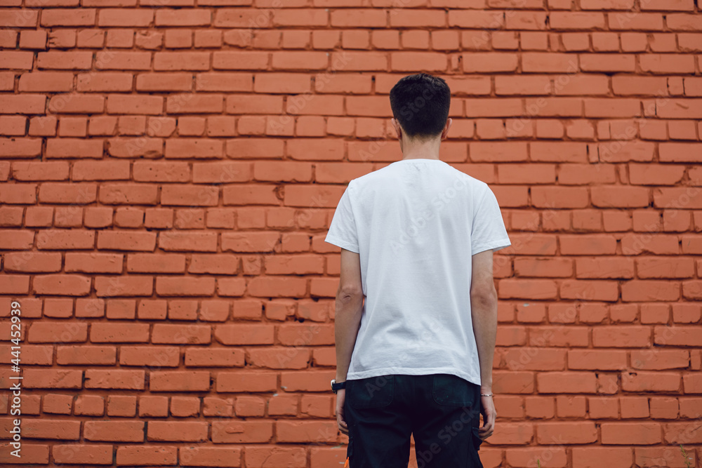 Back view of a guy in a white t-shirt on a red brick wall background.