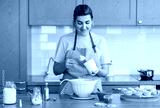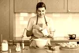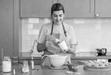 culinary, baking and people concept - happy smiling young woman cooking food on kitchen at home with cupcakes making topping of whipped cream or mascarpone cheese
