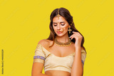 Close up Beauty Portrait indian girl. Jewelry. Young Hindu woman model with kundan jewelry set. Red lips. Close up. Traditional India costume lehenga choli or sari. make-up