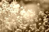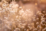 Autumn wild grass and white daisy flowers on a meadow in the rays of the golden hour sun. Seasonal romantic artistic vintage autumn field landscape wildlife background