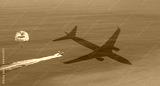 Travel concept - An passenger airplane shadow flying towards a tropical Oludeniz beach - Happy people parasailing on Oludeniz Beach in summer - Fethiye, Turkey