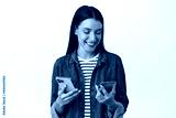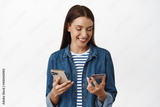 Smiling adult woman looking at her credit card, holding smartphone, paying for purchase, make order on mobile phone app, shopping with telephone, white background
